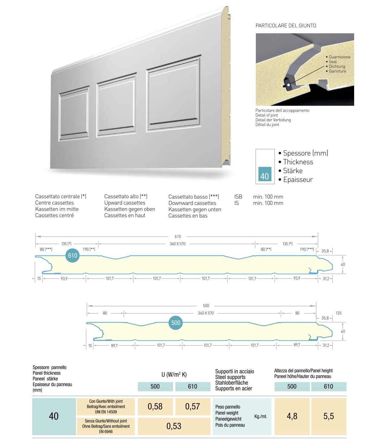 Panel sándwich con aislamiento de espuma de poliuretano para uso en el sector de puertas seccionales para uso residencial. El panel, que consta de dos soportes metálicos, tiene una geometría de junta que evita el aplastamiento cuando las puertas están cerradas.